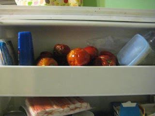 Aren't they beautiful in their Real Red goodness? I love homemade tomato soup but peeling tomatoes is a pain. I like freezing them because they get gooshy when they defrost and I can just squeeze the meat right out of the peel. Here's what they looked like in the morning.